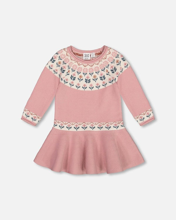 DEUX PAR DEUX KNIT DRESS WITH ROUND INTARSIA FLOWERS LIGHT PINK