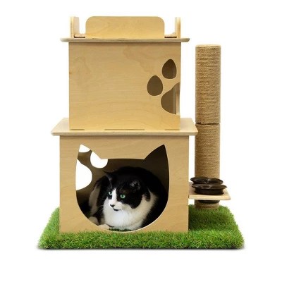 On2Pets Cat House with Scratching Post & Feeder Station – Beige