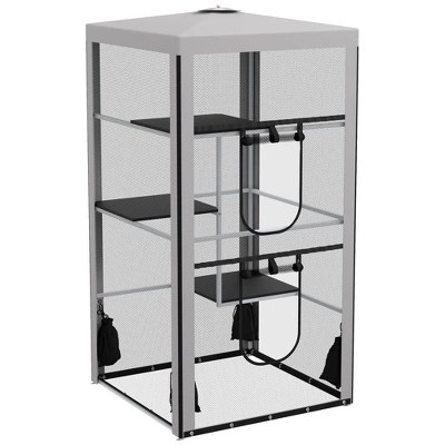 PawHut 79″H Cat House Kitten Enclosure Mesh Playpen Steel Frame with 3 Platforms, 2 Doors and 4 Sandbags for Stability, Indoor/Outdoor