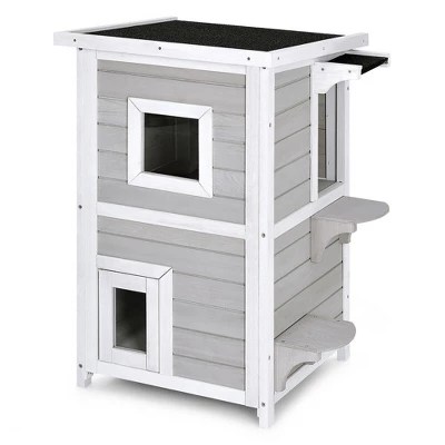 Costway 2-Tier Wooden Cat House Outdoor Kitty Shelter w/ Escape Door Rainproof
