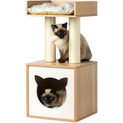 Cat Tree Play House Condo Cube Cave, Platform, Scratcher Post and Ball Toy