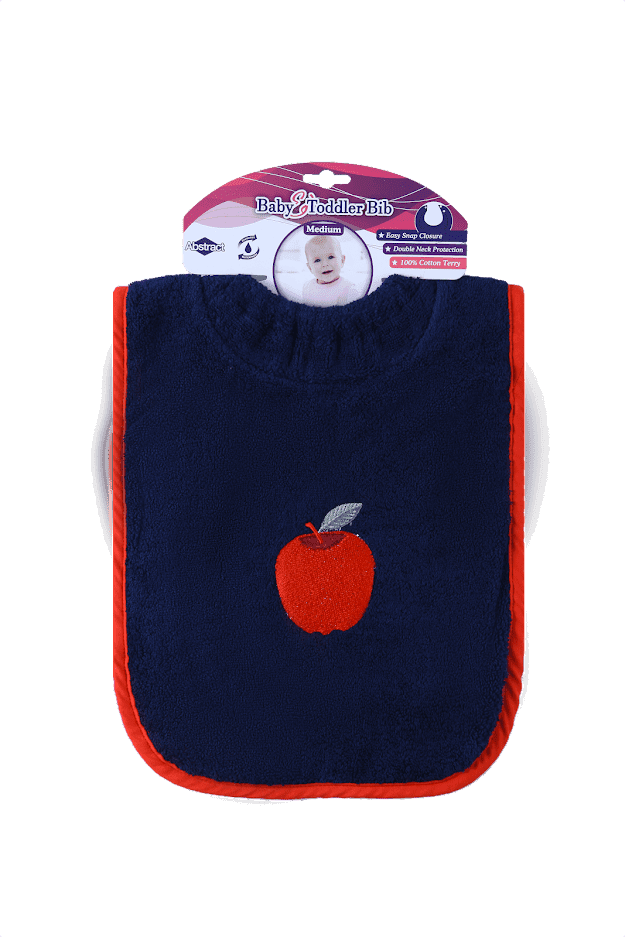 ABSTRACT WATERPROOF BIB WITH SNAPS, NAVY W/ APPLE EMBROIDERY – SMALL