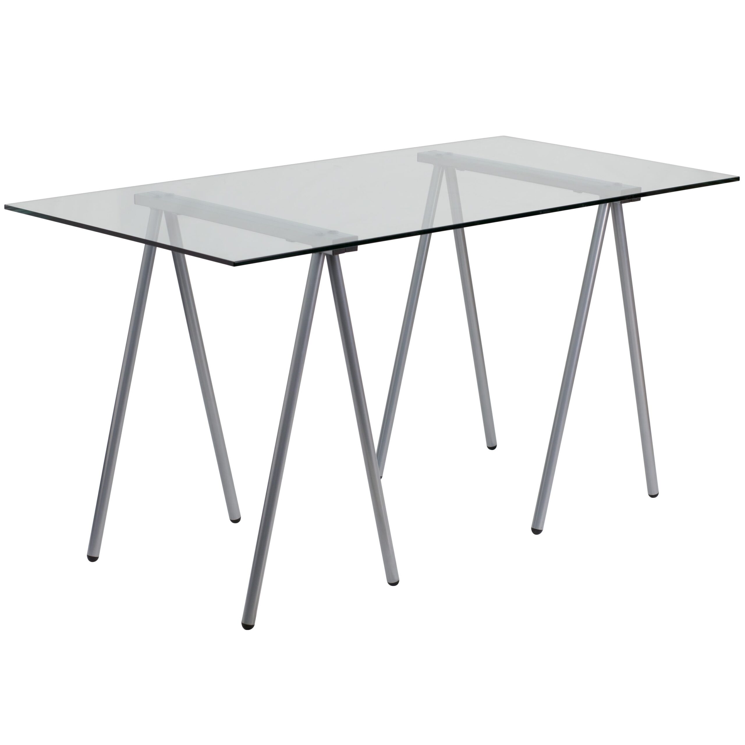 Glass Computer Desk with Pull-Out Keyboard Tray and Crisscross Frame