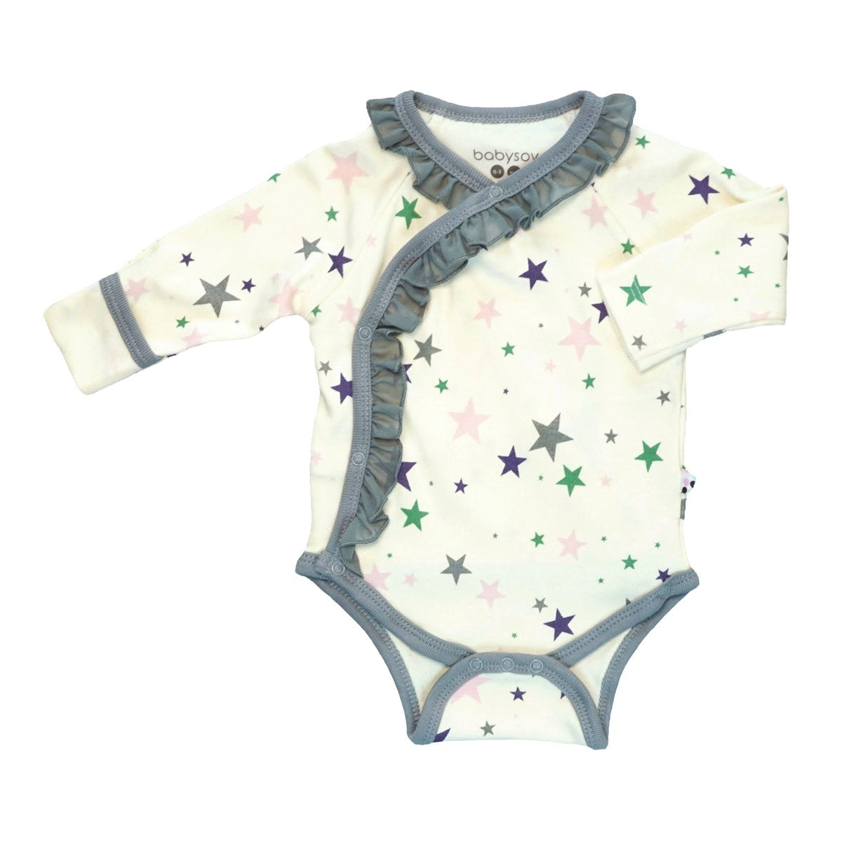BABYSOY STAR LONG SLEEVE RUFFLE BODYSUIT IN THUNDER, 3-6 MONTHS