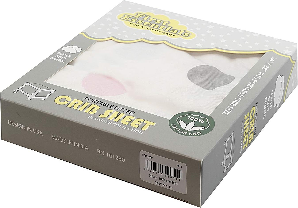 PORTABLE CRIB SHEET WHITE W/ PINK/GREY DOTS