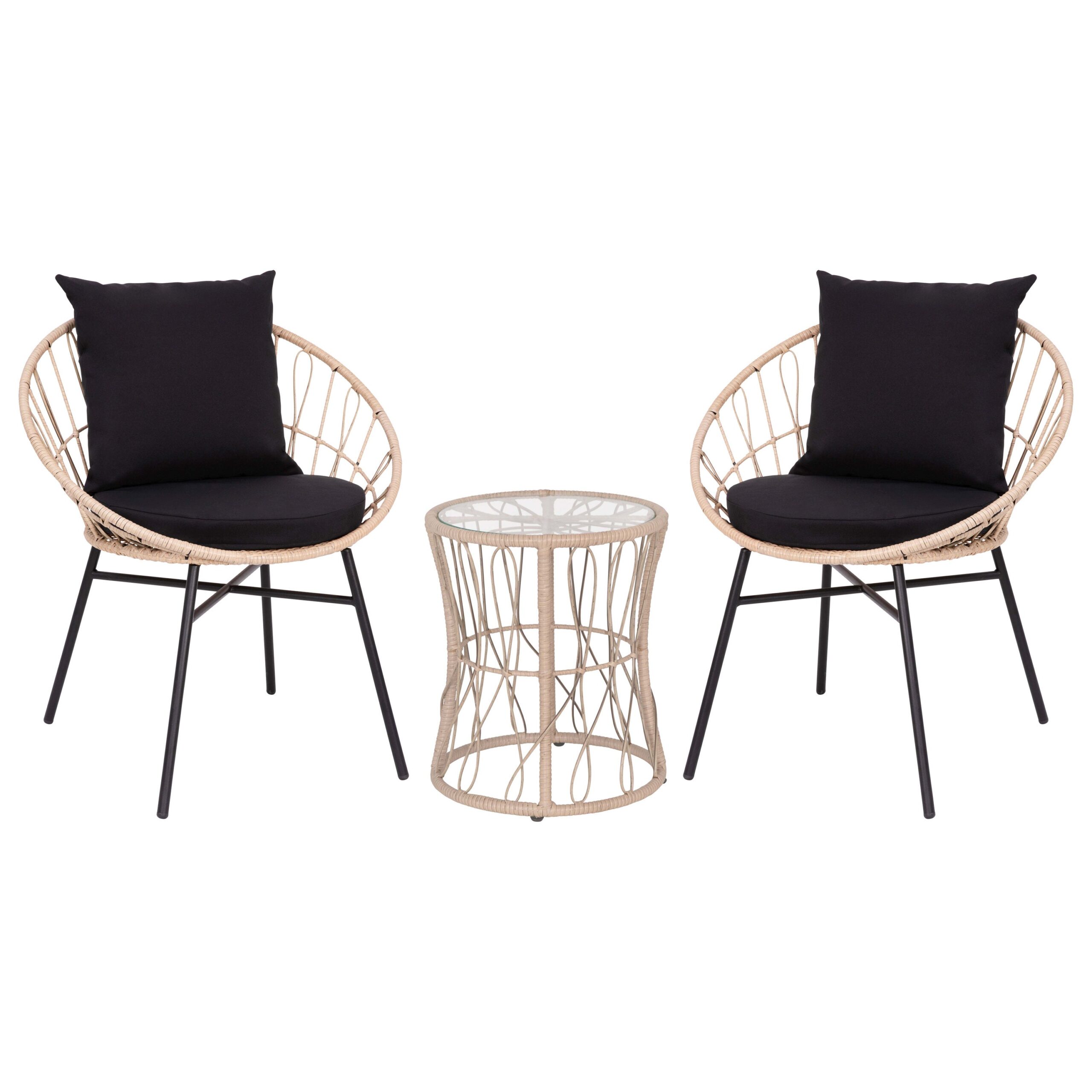 Devon 3-Piece Indoor/Outdoor Bistro Set, Papasan Style Rattan Rope Chairs, Glass Top Side Table /u0026 Cushions