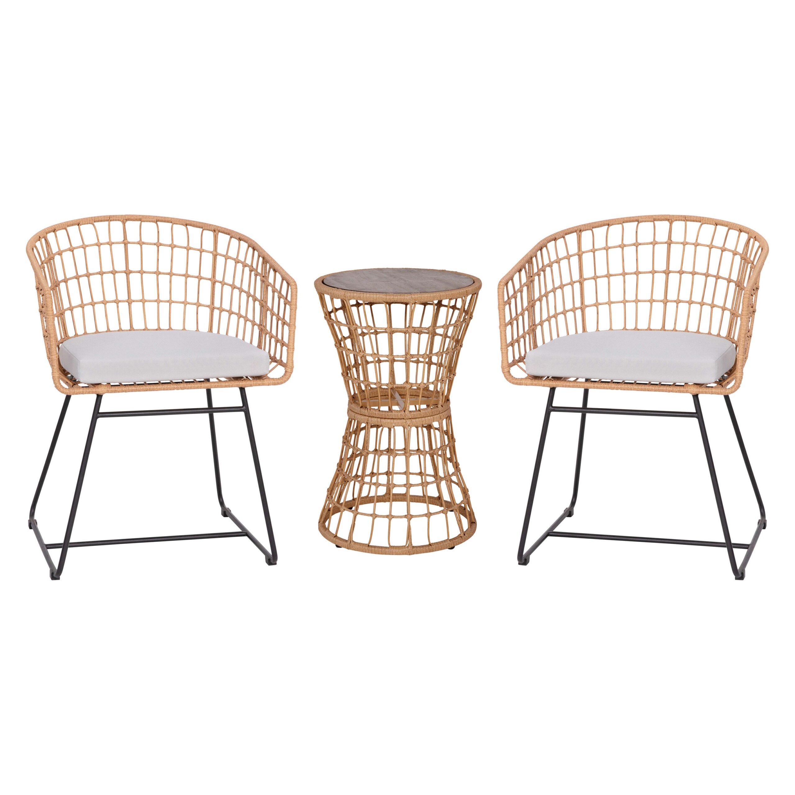 Devon 3-Piece Patio Bistro Set, Indoor/Outdoor Rattan Rope Chairs, Acacia Wood Top Table /u0026 Seat Cushions