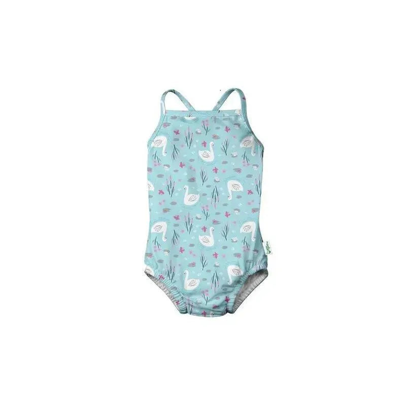 Iplay – Baby Girl Classic Swimsuit with Built-in Reusable Absorbent Swim Diaper, Light Aqua Swan – 3T
