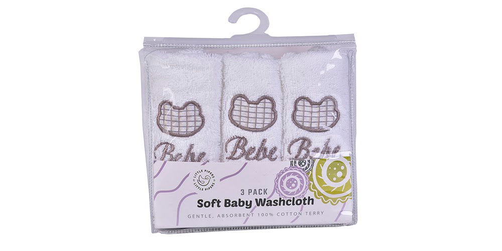 LITTLE PIPERS 3 PK. WASHCLOTH- BEBE DESIGN, WHITE