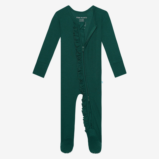 Posh Peanut Footie Ruffled Zippered One Piece | Hunter Green Waffle