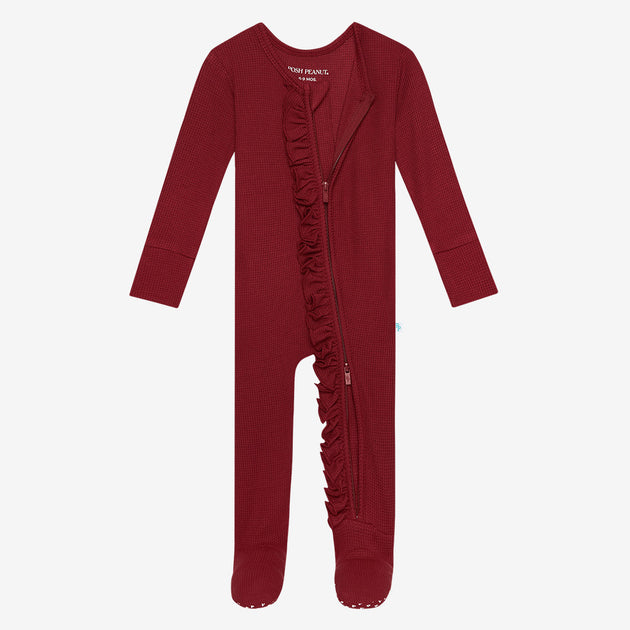 Posh Peanut Footie Ruffled Zippered One Piece | Maroon Waffle