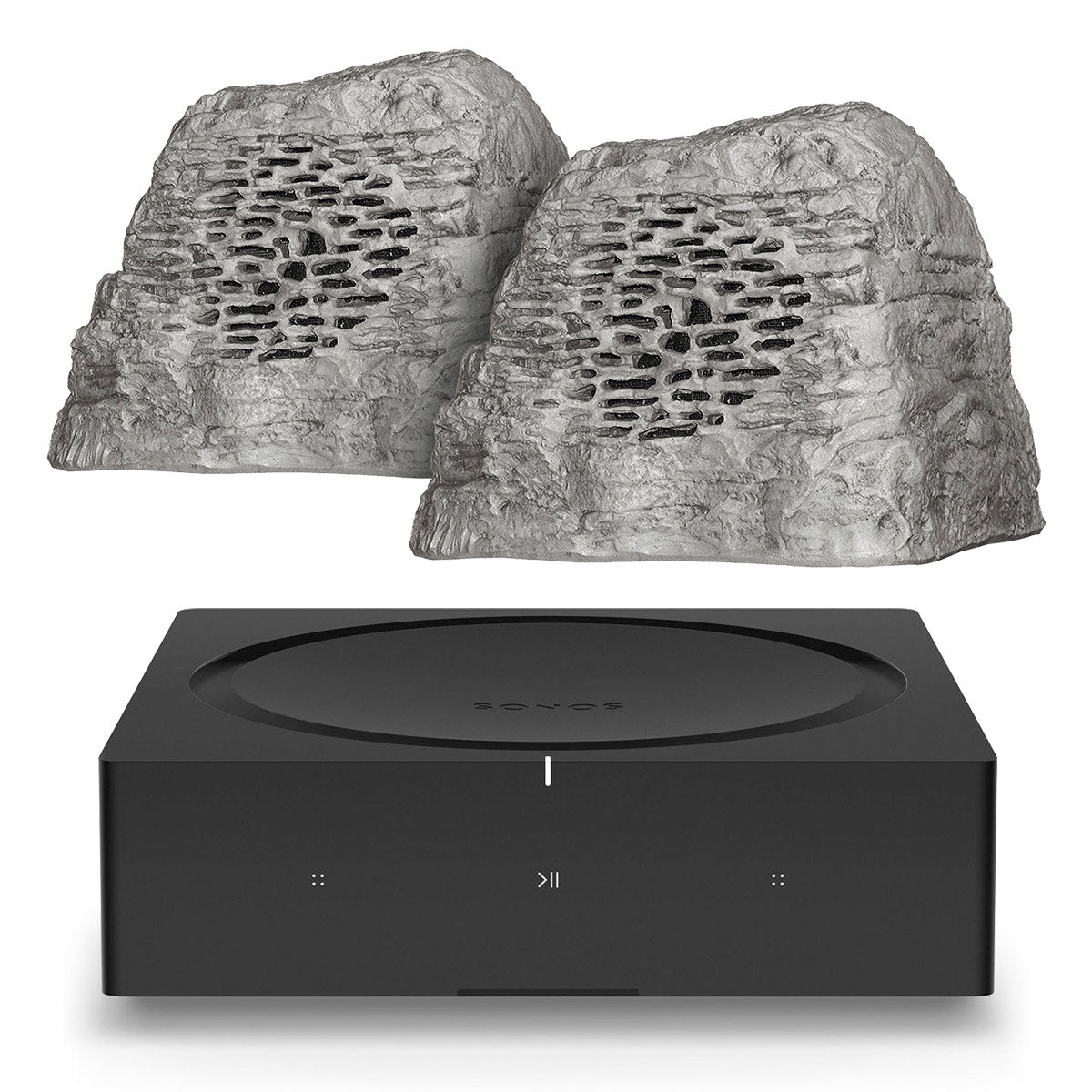 Rockustics EconoRock 6.5″ 2-way Outdoor Powered Rock Speaker – Pair (Grey) with AMP Wireless Hi-Fi Player (Black)