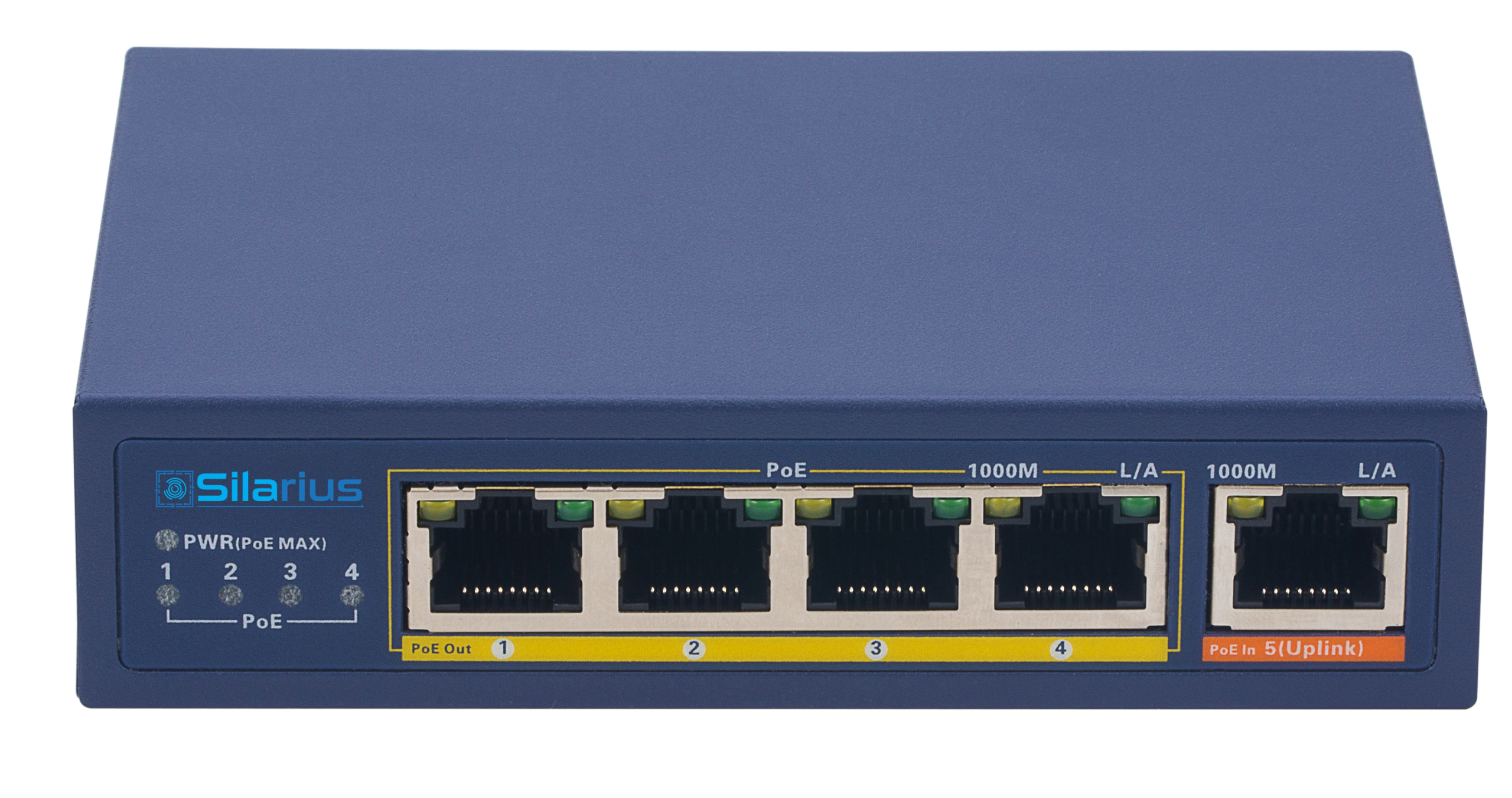 Silarius SIL-SWPP4P65 PoE Powered 5-Port Gigabit Switch with PoE Passthrough, 65W Power Budget for Powering up to 4 PoE Network Devices via Cat5e/Cat6 RJ45 Network Cables – 30W per output port