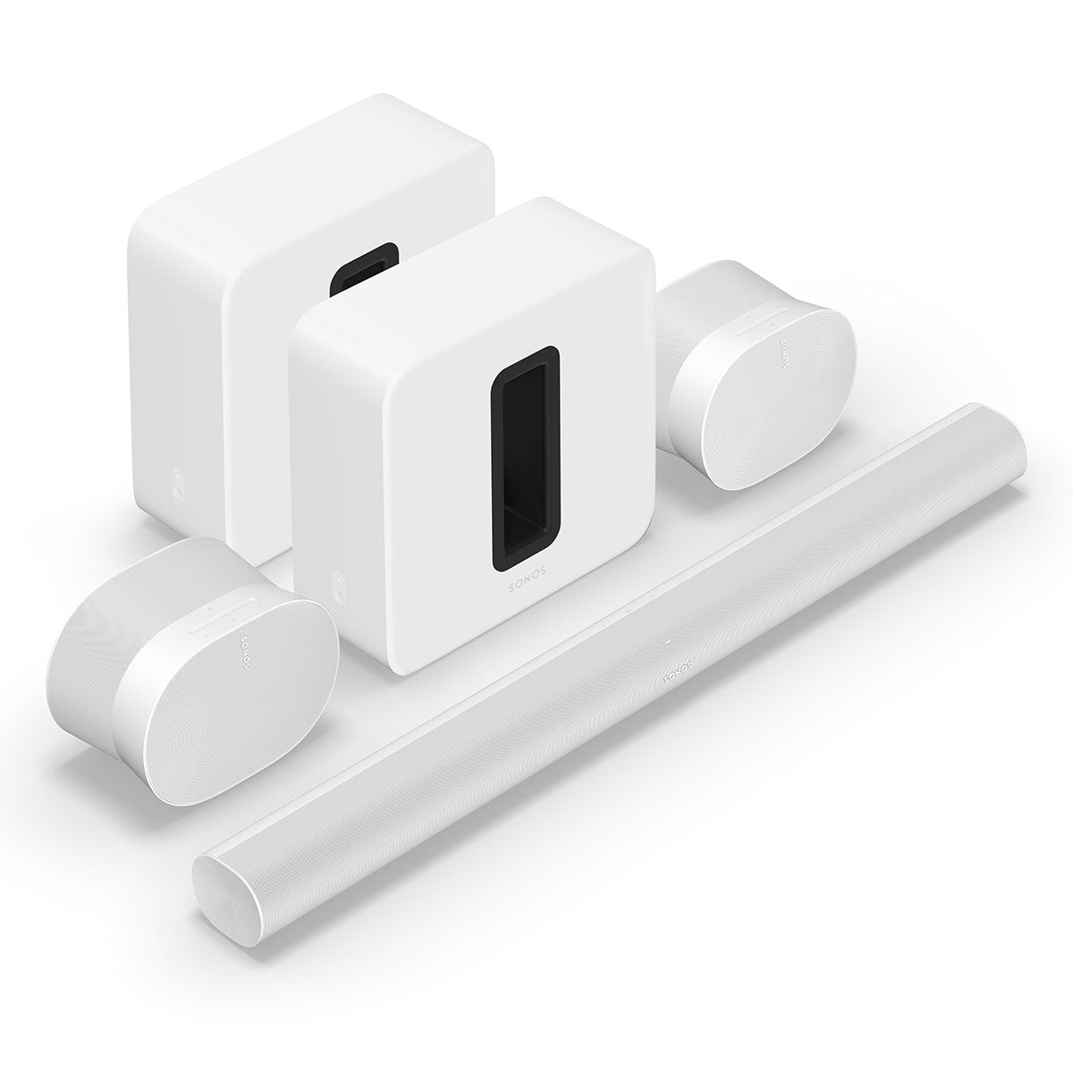 Sonos Ultimate Home Theater Set with Arc Wireless Soundbar, Pair of Sub Wireless Subwoofer (Gen 3), and Pair of Era 300 Wireless Smart Speakers (White)