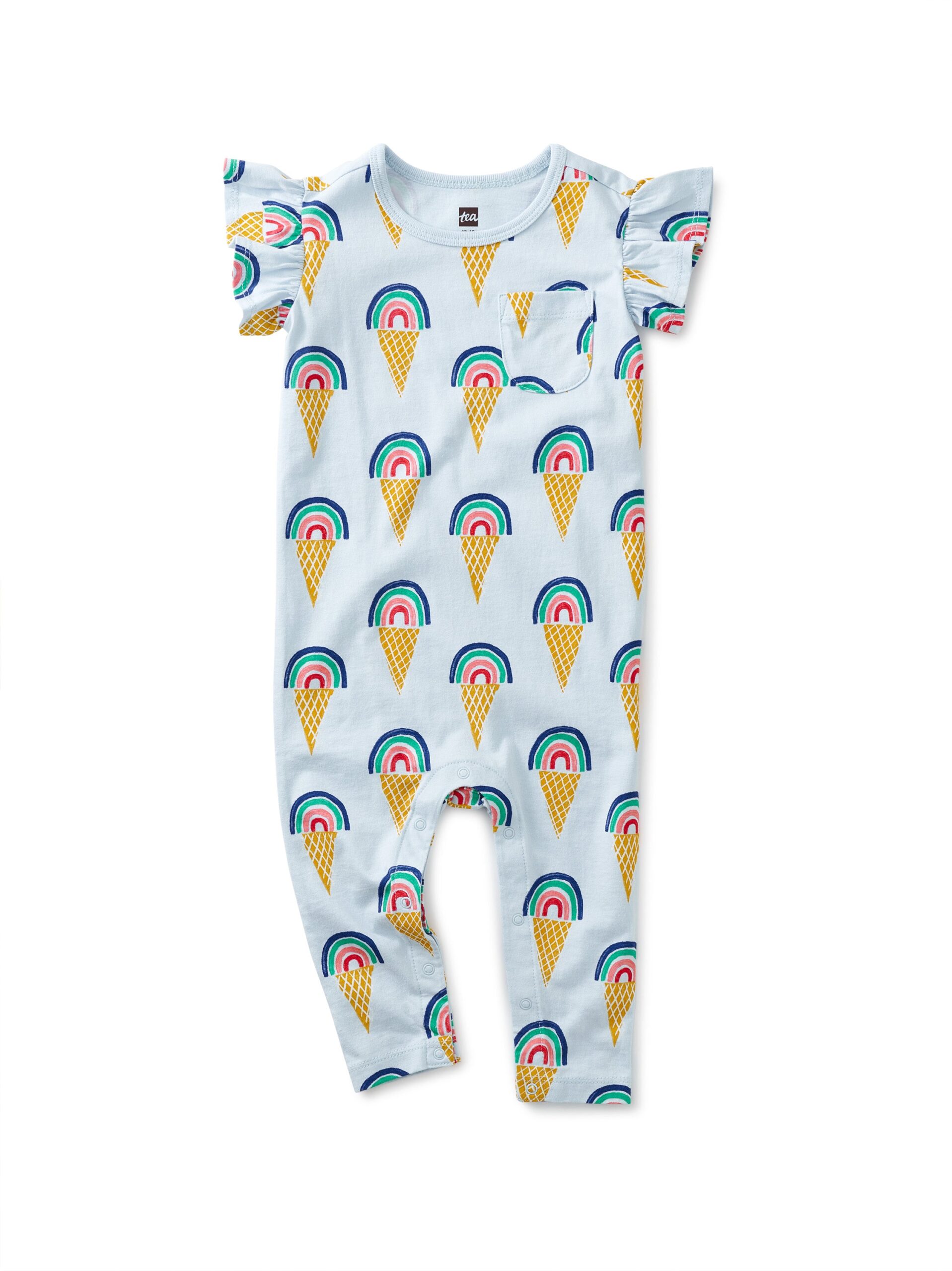 TEA RUFFLE SLEEVE BABY ROMPER- RAINBOW CONES IN BLUE
