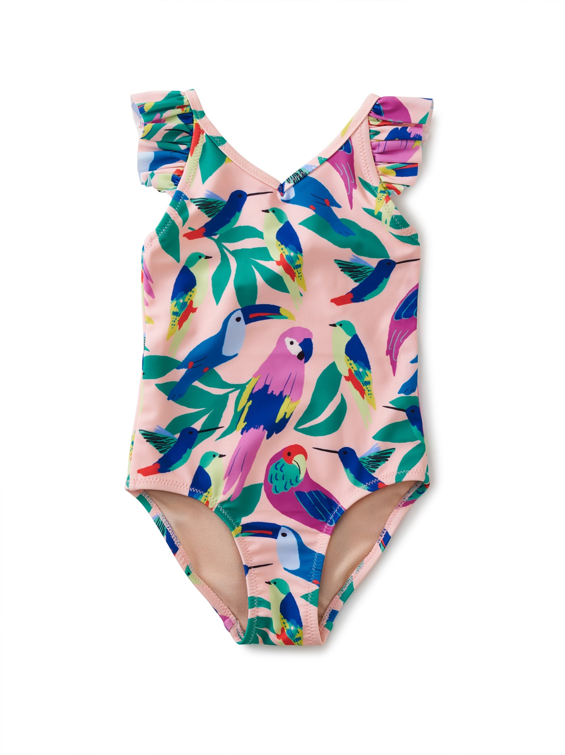 TEA RUFFLE ONE-PIECE SWIMSUIT – TROPICAL BIRD FLOCK IN PINK