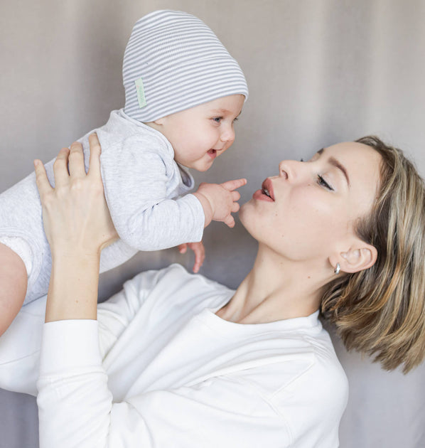 GRAY WHITE STRIPED WITH MIXED POM NEWBORN HOSPITAL HAT