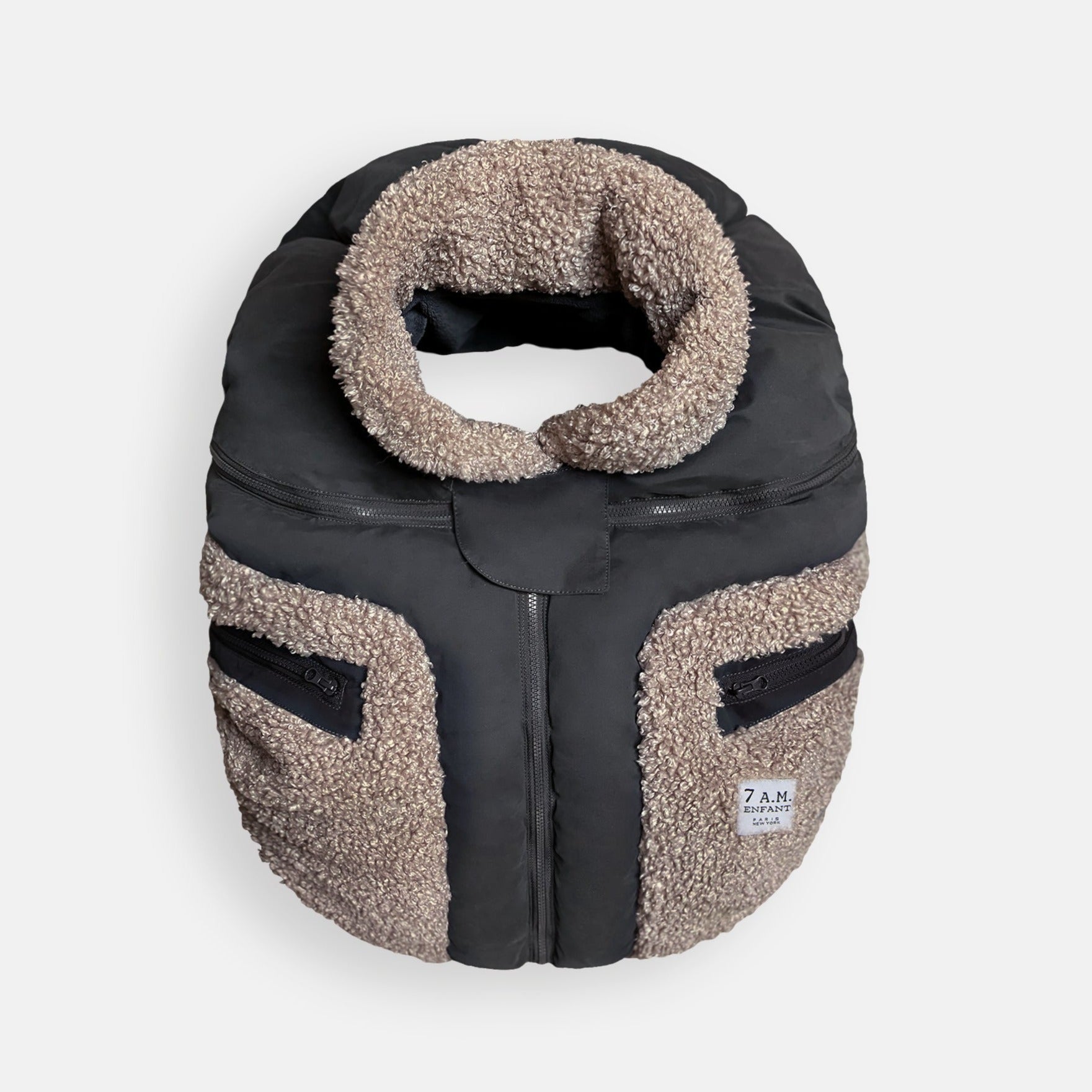 • Front flap can be pulled up and fastened to hood to protect child’s face from the elements
