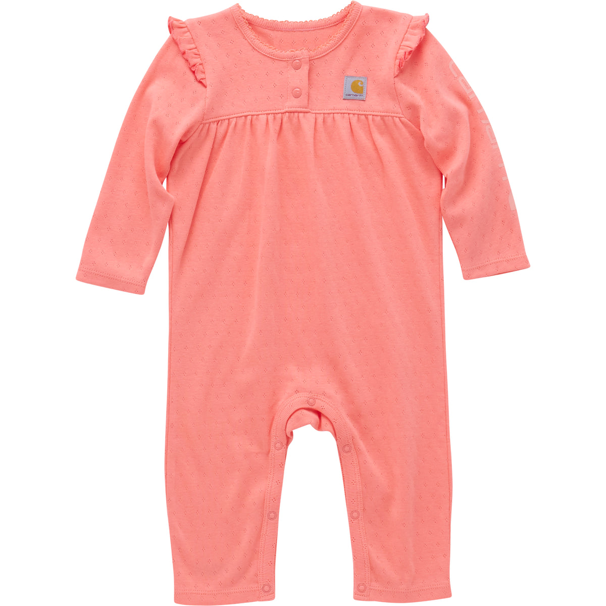 The delicate knit texture of this baby girls’ coverall may make it look sweet. The ruffles are like icing on the cotton. But the real proof you know it’ll last is the Carhartt label stitched on the chest. Snaps make it quick and easy to get it on and off.