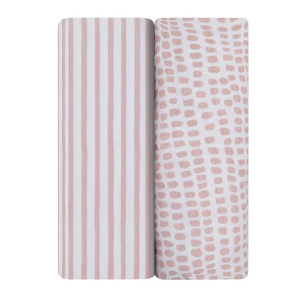 This convenient two-pack features a modern and playful forest grey floral on white, combed jersey knit cotton. You can be rest assured that your baby�s sleep surface will always be covered with a clean, trendy, and soft cotton sheet with this bassinet sheet set!
