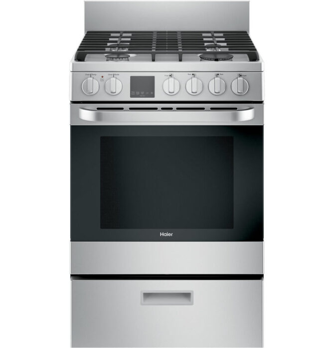 Enhance your kitchen with this freestanding gas range by Haier. This unit features 4 sealed gas burners, gas fan convection for even baking and a modular backguard to keep your kitchen clean. Heavy duty continuous cast iron grates allow for easy movement of cookware while providing even heat distribution with excellent heat retention. The oven features 2.9 cu. ft. of capacity, allowing you to easily prepare a variety of meals. Enjoy cooking with convection as rear fans distribute hot air throughout the oven for fast, more even baking. This 24″ range matches the HMV1472BHS 24″ over-the-range microwave in width and… Enhance your kitchen with this freestanding gas range by Haier. This unit features 4 sealed gas burners, gas fan convection for even baking and a modular backguard to keep your kitchen clean. Heavy duty continuous cast iron grates allow for easy movement of cookware while providing even heat distribution with excellent heat retention. The oven features 2.9 cu. ft. of capacity, allowing you to easily prepare a variety of meals. Enjoy cooking with convection as rear fans distribute hot air throughout the oven for fast, more even baking.This 24″ range matches the HMV1472BHS 24″ over-the-range microwave in width and appearance, creating a perfect pair Read more Specifications