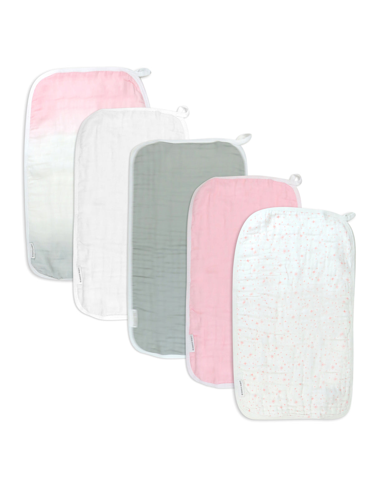 Every parent could use a little extra help sometimes. That’s why we designed these burp cloths to give you that extra protection when you need it most. With three layers of 100% organic cotton muslin, these burp cloths are both absorbent and breathable. No bumpy seams in the middle mean extra comfort for baby’s sensitive skin, and the fabric just keeps getting better, wash after wash after wash! You are covered (literally) with this 5-pack so you can have some at home and extras to take with you when you’re on the go.