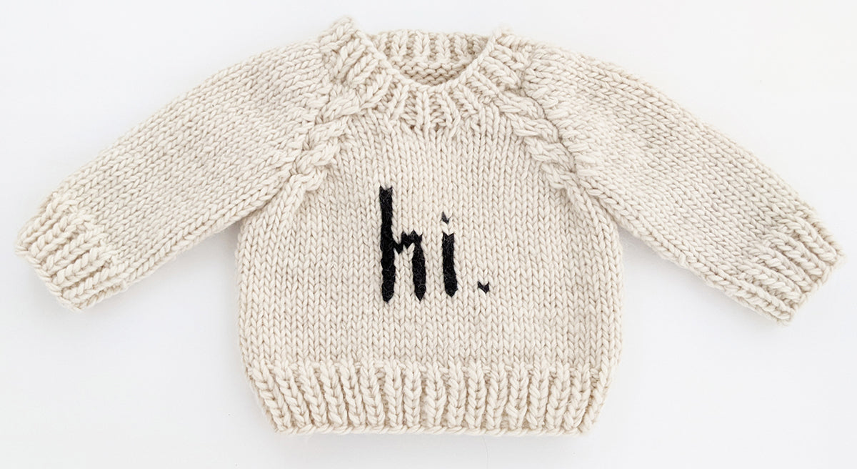 What a fun way to greet the world! Say hi. with our cozy pullover sweater. It has cable trim raglan sleeves with hi. knit into the front in black yarn. The neck is softly knit, making it easy to pull over little heads. Hand-knit in beautiful natural colored yarn, it is soft and warm. This is such a great gender neutral sweater, perfect for any little person.