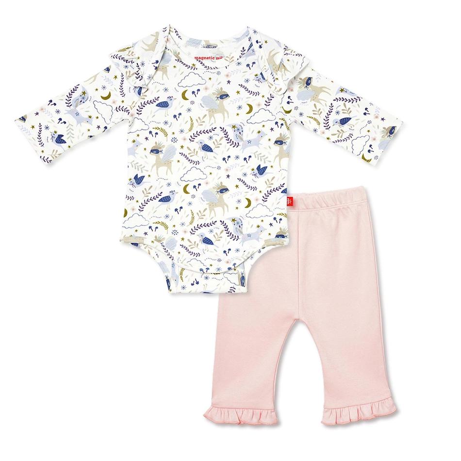 Introducing the Magnetic Me In-Dog-Nito II Modal Coverall. Piggies out with easy-on, easy-off, coveralls! A soft, stylish wardrobe staple ideal for indoor or outside play, and snoozin the night away. Perfect for nibbling toes, crawling, or going to market. Simply open the outfit, insert baby, and the smart magnetic fasteners practically close themselves! Machine wash as directed.