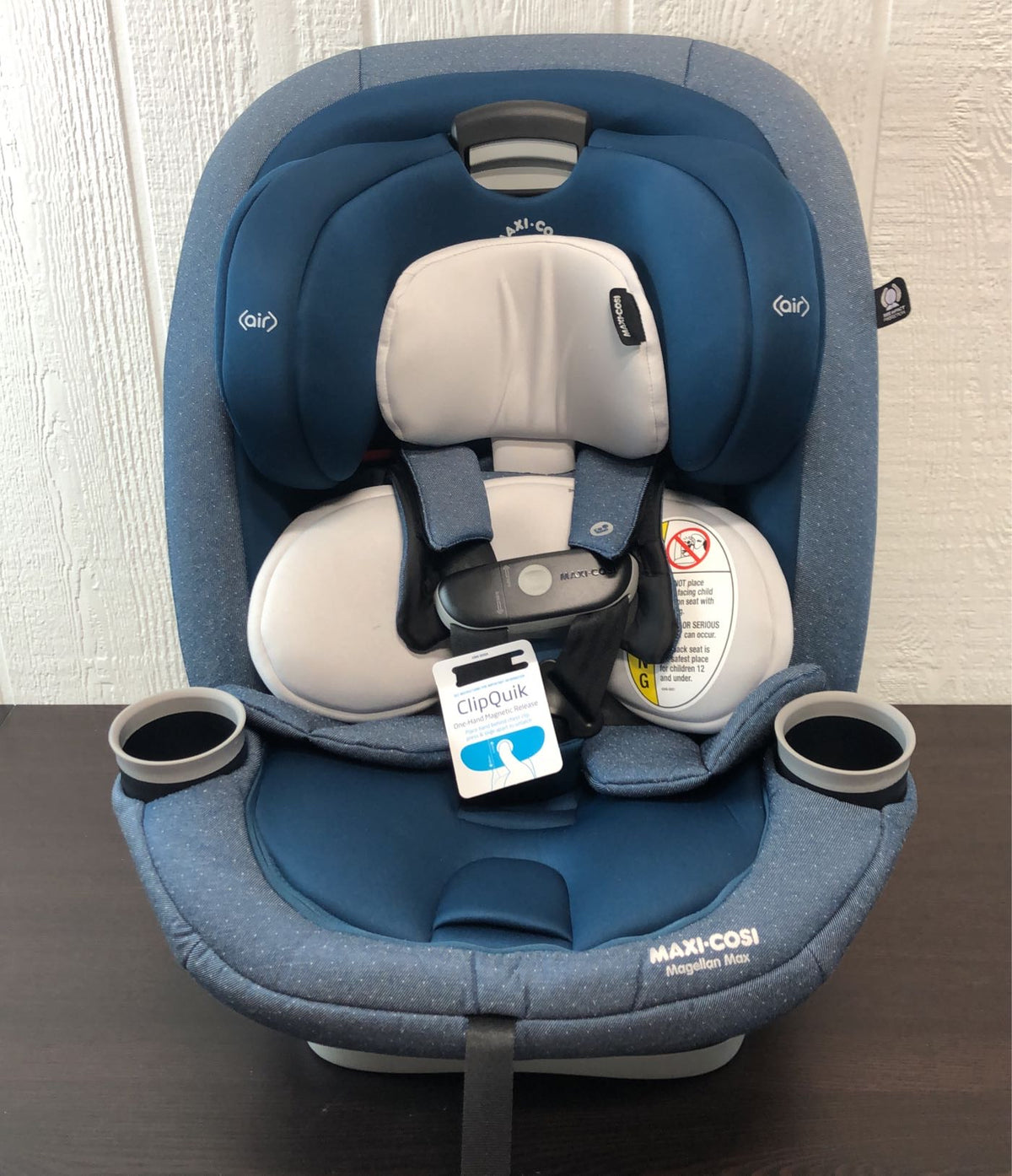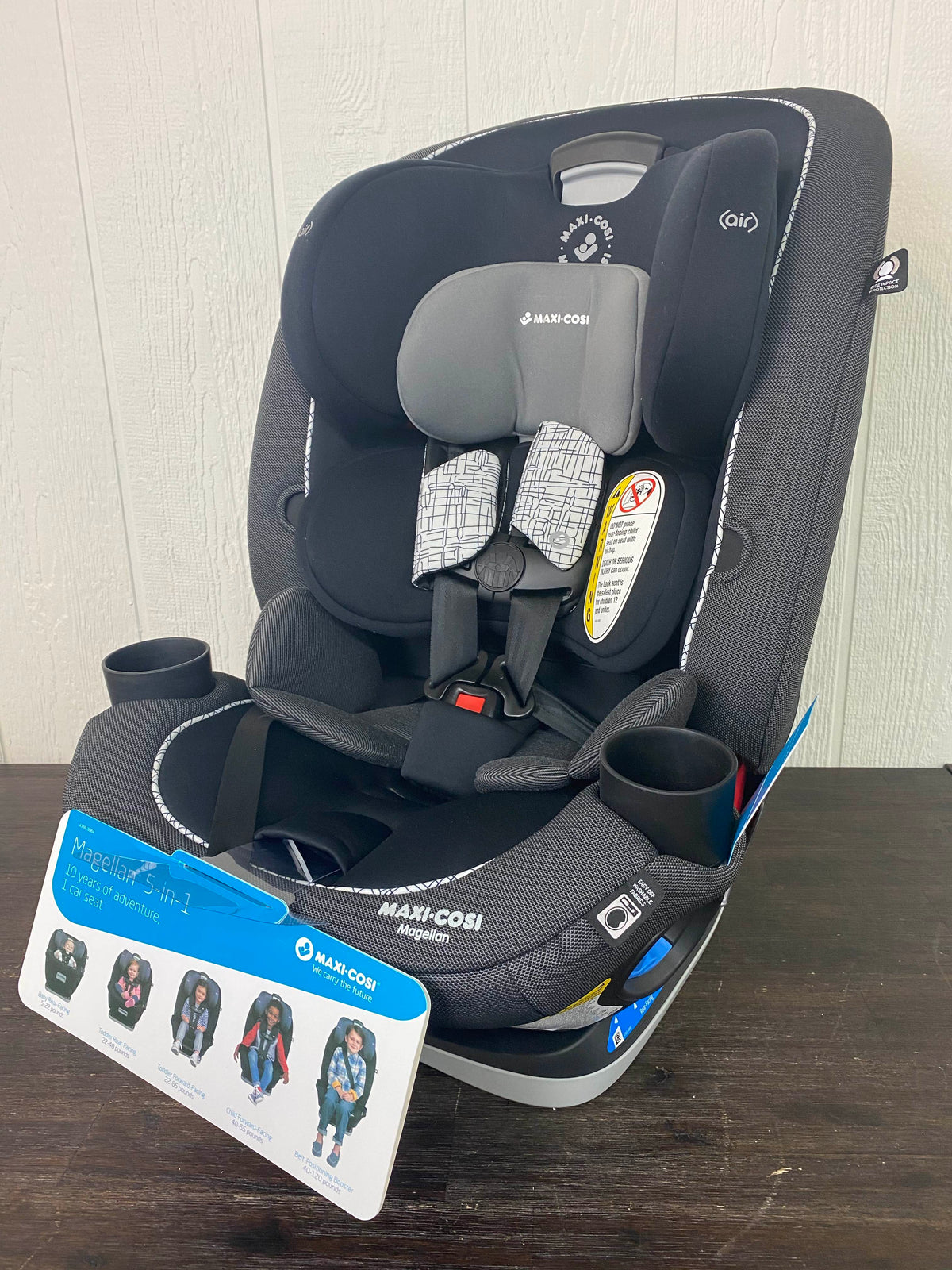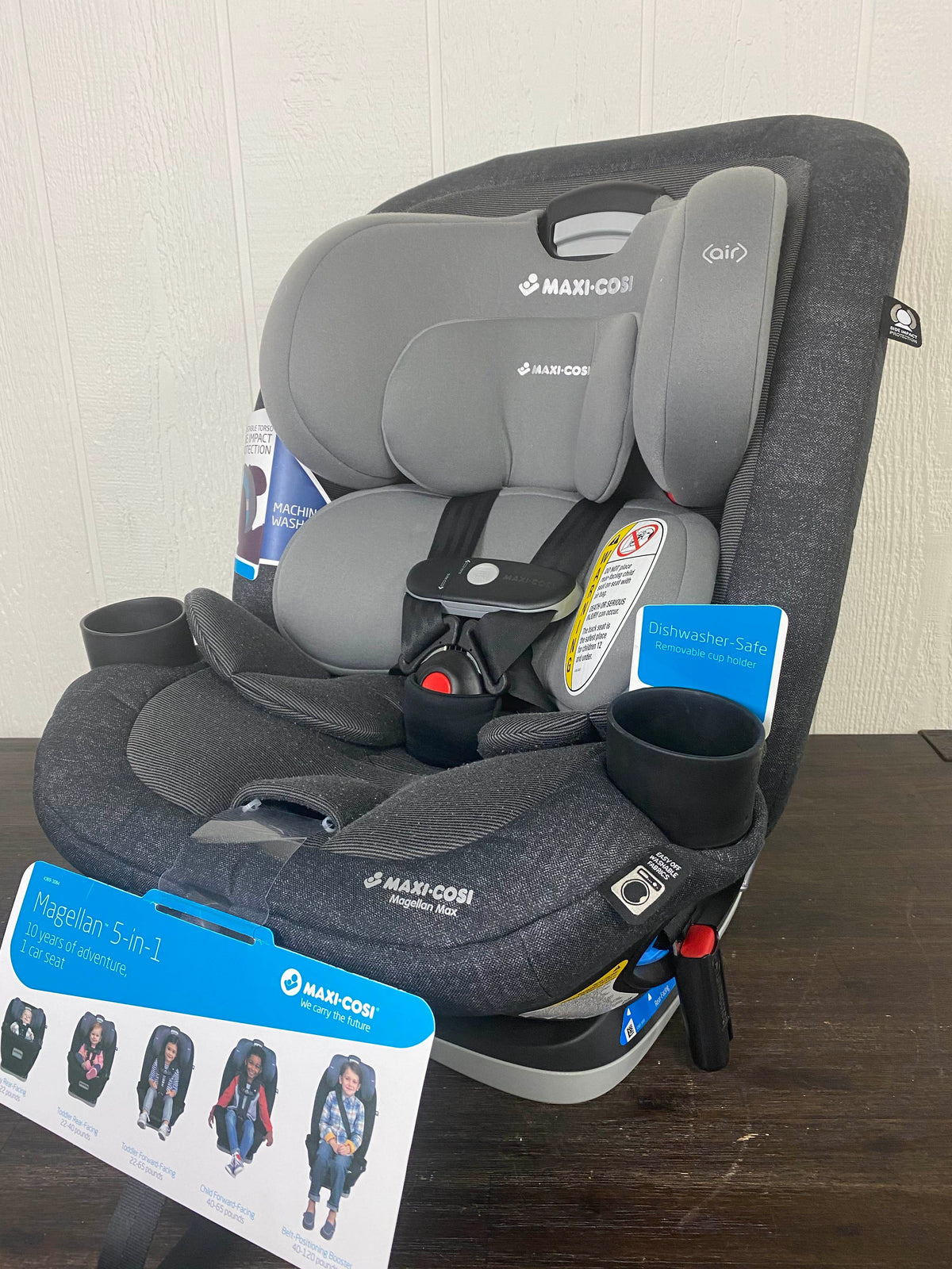 “The Magellan 5-in-1 car seat is designed so that you only have to buy one car seat! Designed to fit children from birth to 10 years old(5-120 pounds), this car seat does it all. The head rest has 14 adjustable positions, a 7 position recline option, harness holders, an included infant insert, as well as dishwasher safe cup holders.”