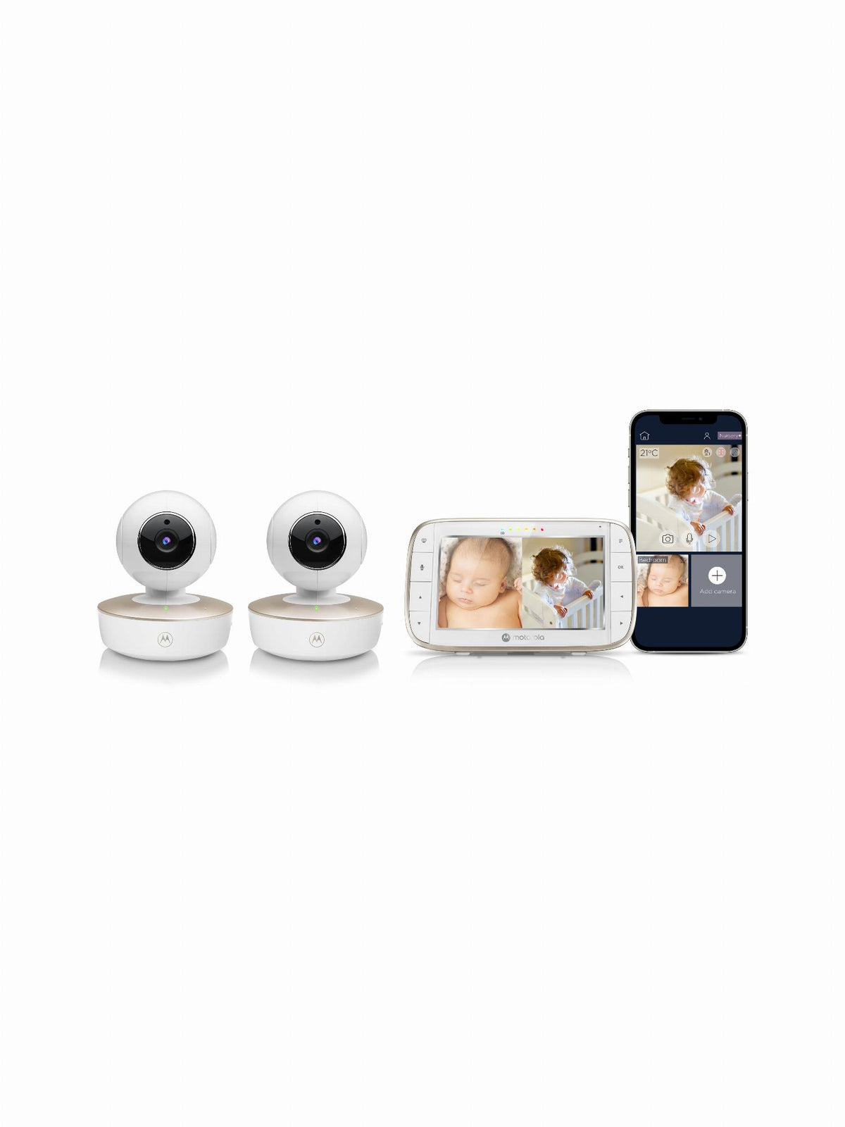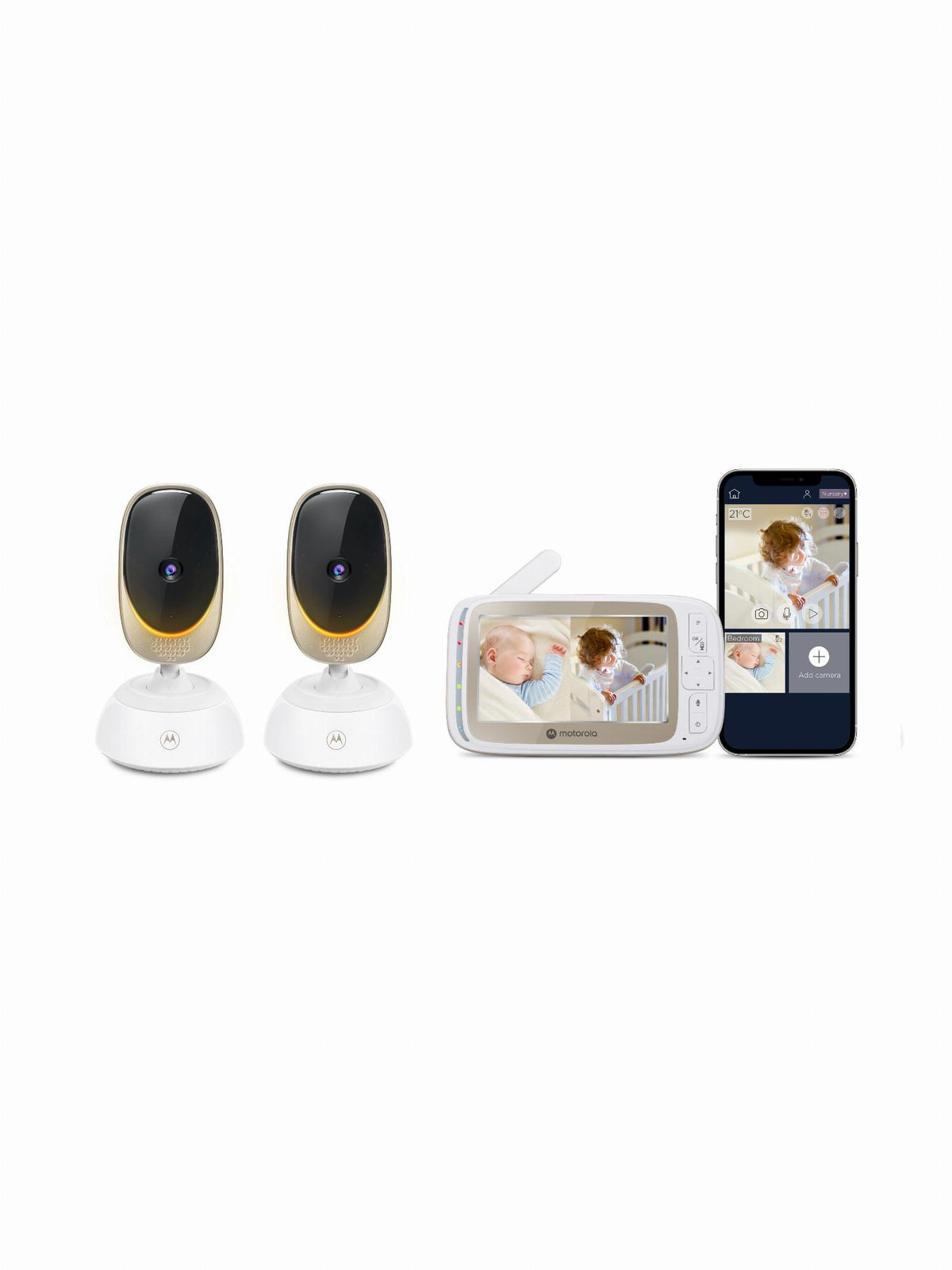 WiFi connectivity for on-the-go viewing; 2.4GHZ FHSS wireless connectivity for in-home viewing 5” diagonal color screen with support stand Motorized pan, tilt, and zoom AC Power Adaptor or Lithium Battery for Parent Unit AC Power Adaptor for Camera View in 1080p Full HD on compatible smartphones and tablets Two-way talk and room temperature monitoring Infrared night vision Up to 1,000ft range Preloaded nature sounds, lullabies, and audiobooks Visual sound level indicator Volume control on parent unit Out-of-range and low battery alerts Split Screen Viewing available with additional cameras (sold separately) Wall mountable 2-year limited warranty