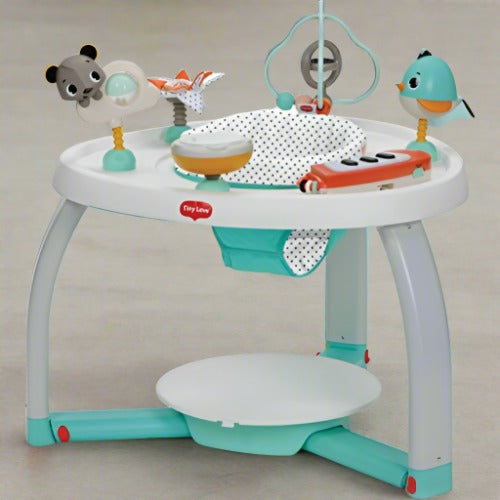 Oh the places you’ll go! The ExerSaucer® World Explorer Triple Fun+ Bouncing Activity Saucer offers 2+ years of developmental play with 3 stages of use. The stage 1 play mat with toy bar can be used from birth and offers a soft place for baby to explore on their back. As they grow, tummy time is essential for core muscle development. The stage 2 bouncing activity saucer features 360 degree seat spin, a unique rocking base, 25+ activities, lights, sounds and a variety of colors and textures for loads of learning fun! After baby has learned to walk, the activity center converts to an activity table for cruising playtime and play dates. The World Explorer also features an exclusive Learning+ Language Pod that speaks in four different languages. Scroll through the traveling scenes and the Language Pod responds in English, French, Spanish or Mandarin! Pete the panda and Eli the elephant will be your child’s tour guides as they let their imaginations run wild. Other features you’ll love include a removable, machine-washable seat cushion, easy-to-clean toys and three easy-to-adjust height settings. The World Explorer Triple Fun+ is a safe and entertaining environment to bounce, reach, turn, stretch and explore the world at their fingertips!