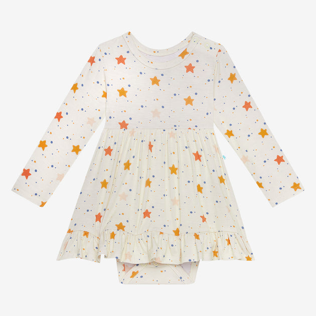Posh Peanut® long-sleeve bubbles are perfect for cooler months in signature, ultra-soft Päpook® bamboo. Ruffle details, snap closure on the shoulder for fast and easy changing. Features: • Long sleeves with scoop neckline
