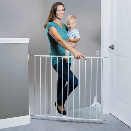 - FIT: Perfect for hallway, doorway, open spaces and bottom of stairs. Includes two 4-inch wide extensions kits. Gate folds flat for easy storage