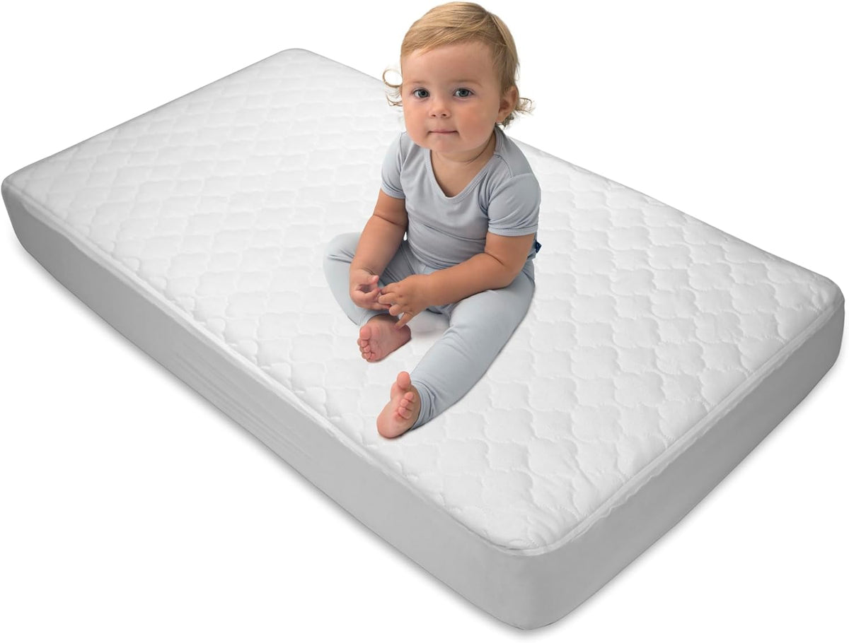 Product Description Keep baby dry and comfortable with these waterproof crib mattress pads. Featuring a SecureStay stretch skirt for a perfectly snug fit and plush quilt exterior, these pads are 100% waterproof and machine washable.