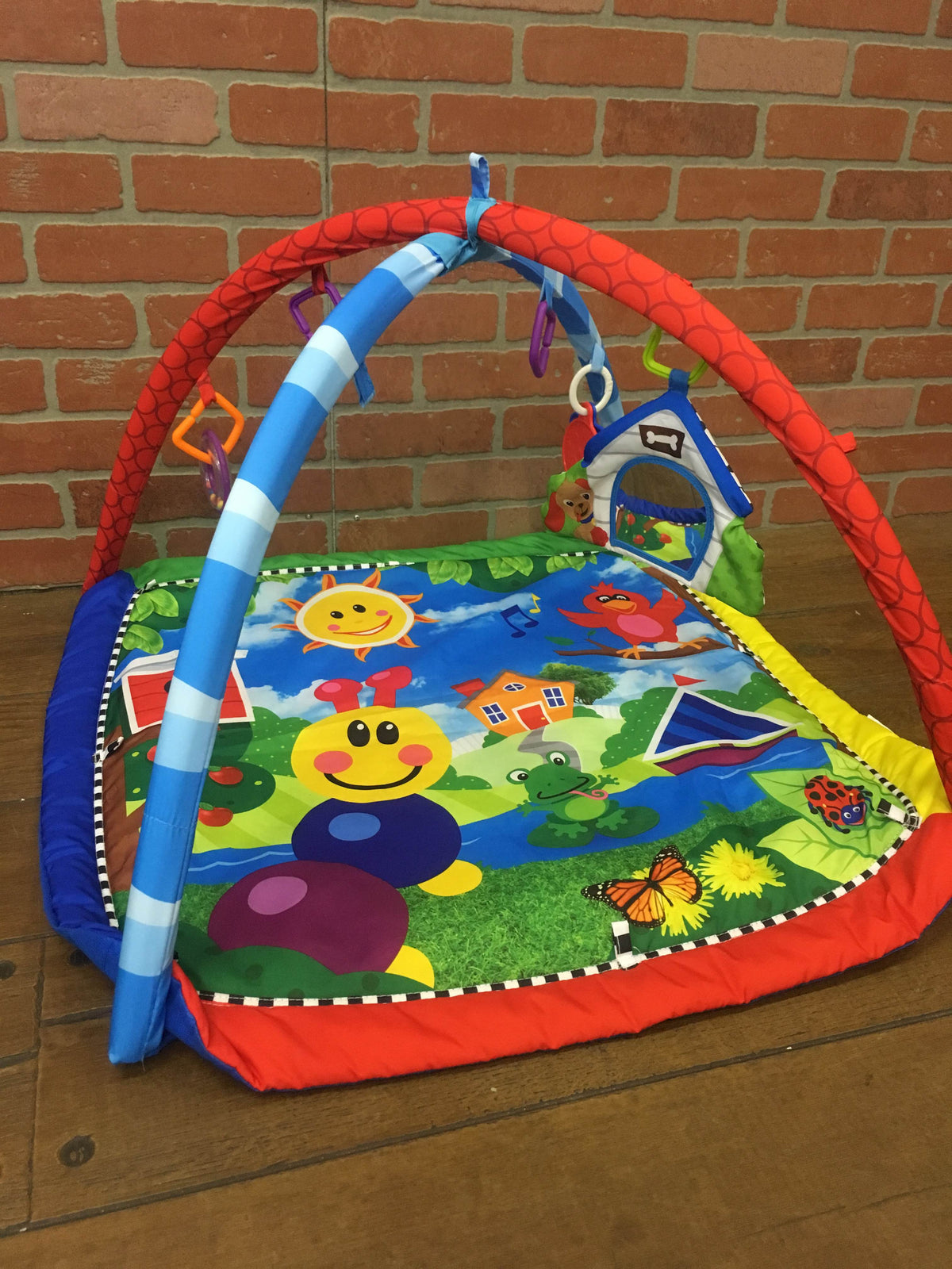 “Lots to do in the treetop! This activity gym engages baby with friendly faces and multi-sensory features. It includes a tummy time pillow and 5 hanging toys.”