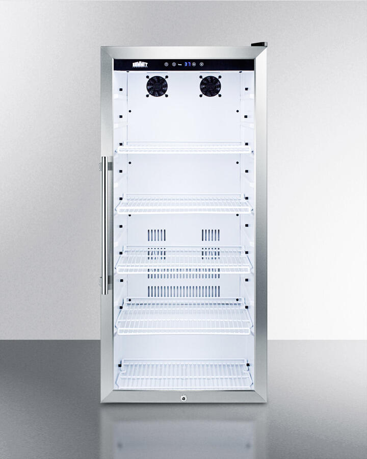 SUMMIT COMMERCIAL’s SCR600BGLBI Series features 24″ wide beverage refrigerators designed and manufactured in Europe for built-in undercounter installation in commercial settings. Sized with a convenient 24″ footprint and generous 5.5 cu.ft. interior, the SCR600BGLBISH features a front-breathing design for built-in installation under counters, with a fully finished black cabinet that also allows freestanding use. The door features double pane tempered glass for added protection, with a brushed aluminum finish on the frame. We include our “SH” full-length towel bar style handle in brushed stainless steel. The factory-installed front lock is located towards the top of the door for easier access…. SUMMIT COMMERCIAL’s SCR600BGLBI Series features 24″ wide beverage refrigerators designed and manufactured in Europe for built-in undercounter installation in commercial settings. Sized with a convenient 24″ footprint and generous 5.5 cu.ft. interior, the SCR600BGLBISH features a front-breathing design for built-in installation under counters, with a fully finished black cabinet that also allows freestanding use. The door features double pane tempered glass for added protection, with a brushed aluminum finish on the frame. We include our “SH” full-length towel bar style handle in brushed stainless steel. The factory-installed front lock is located towards the top of the door for easier access. Inside, the SCR600BGLBISH includes four adjustable glass shelves for spill-proof storage and a half-sized wire shelf ideal for holding bottles in place. Automatic defrost ensures minimum user maintenance and a dial thermostat makes it simple to manage the temperature. This unit features an interior light operated with an ON/OFF rocker switch and a white interior finish to ensure optimum product visibility. Our unique “hidden” evaporator is located in the rear wall to help protect the unit’s system and maximize shelf space. An internal fan helps to ensure the interior is more evenly cooled from top to bottom. The SCR600BGLBISH is ETL-S listed to NSF-7 commercial standards. For this unit sized at 32″ for use under lower ADA compliant counters, see the SCR600GBLBIADA series. Read more Specifications