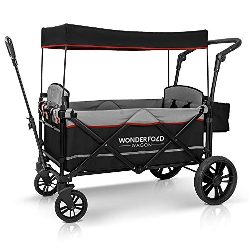 - PERFECT COLLAPSIBLE WAGON – Folds easily and holds up to 2 passengers with five-point adjustable safety harnesses with automatic magnetic buckles to keep the little ones secure